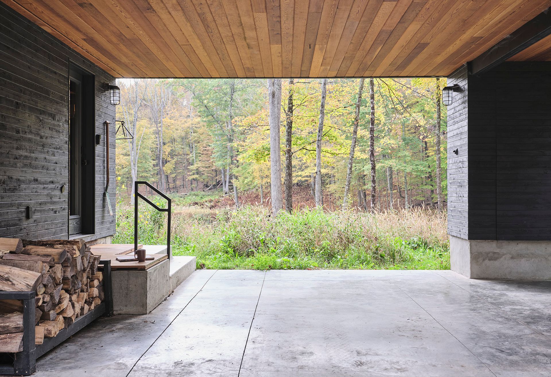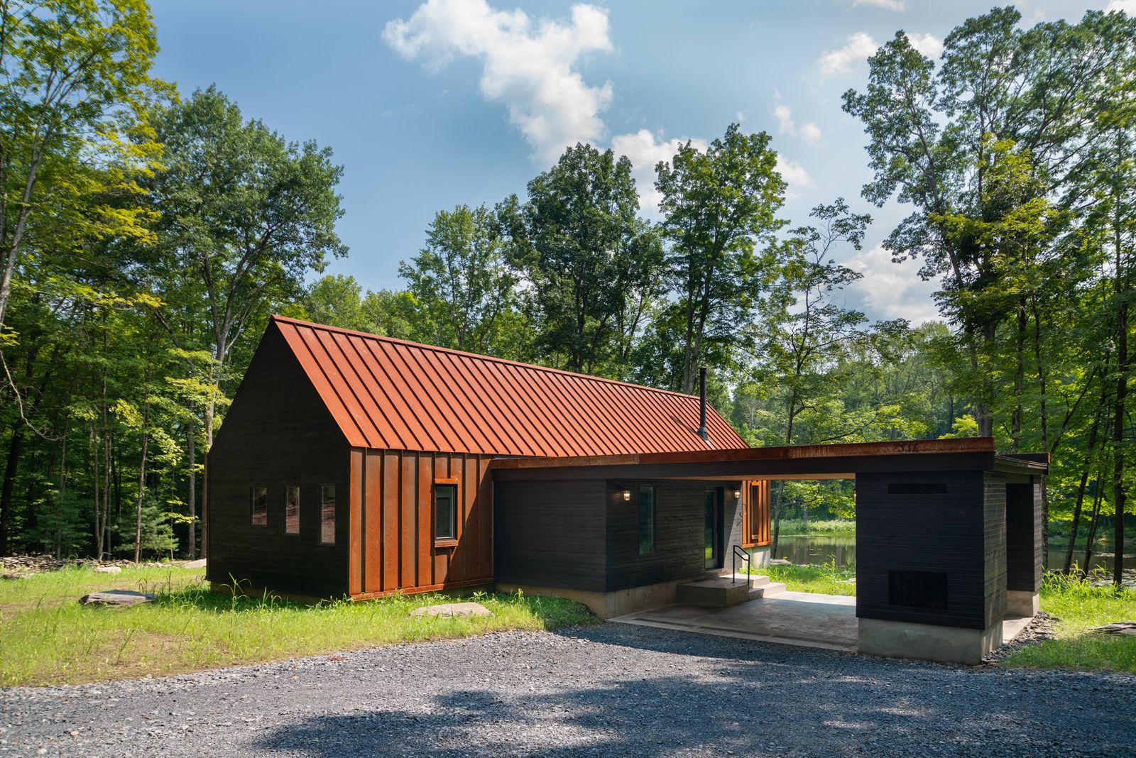 The Pond House uses a simple gable form oriented to face south and overlook the pond. It has a a flat roof extension to shield the entry and cover the connected outdoor space. The exterior is rusted standing seam Corten with blackened cedar at the exposed gable ends.